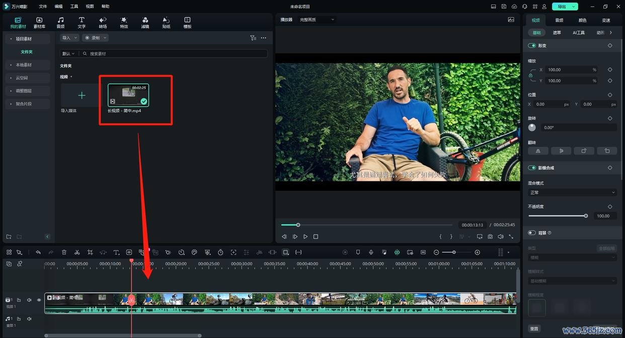 拖入技术线:将视频拖入下方的技术线,准备进行编著操作。