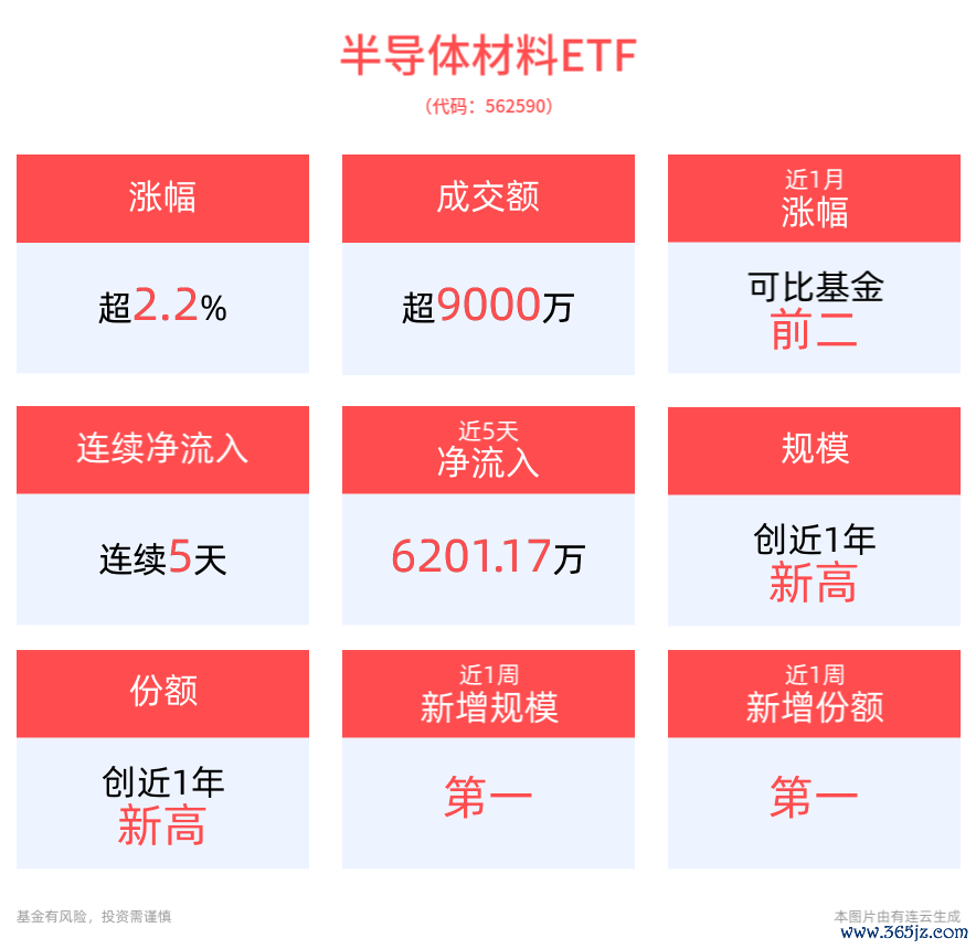 2024年10月21日,半导体指数涨幅居前,甩手收盘,半导体材料ETF(562590)涨2.20%,盘中一度涨超7%。近日,半导体投资升温,半导体材料ETF(562590)流畅5日获资金净流入,累计6201万元开云(中国)Kaiyun·官方网站 - 登录入口,拉万古间看,半导体材料ETF(562590)近60日得回资金净流入1.23亿元。