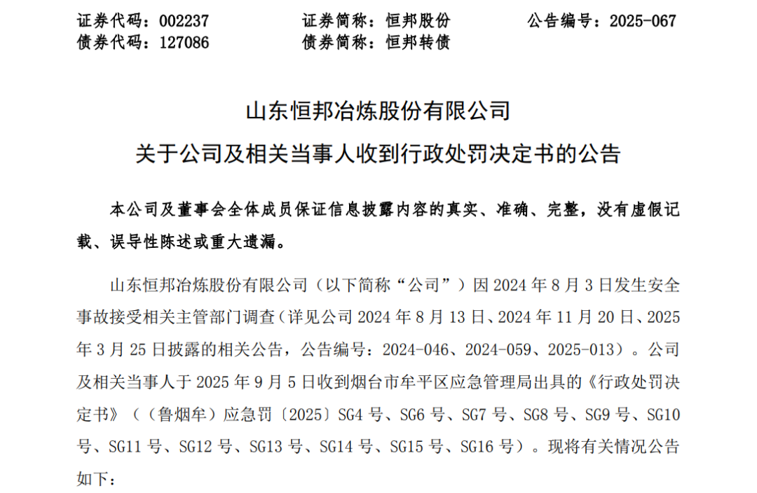 9月8日,恒邦股份发布公告败露,其于2025年9月5日收到了烟台市牟平区救急管制局出具的《行政处罚决定书》,阐明2024年8月3日发生在该公司冶真金不怕火一公司的灼烫事故,不仅变成3东说念主归天、14东说念主受伤(其中2东说念主重伤)的严重效力和814.7万元的班师经济失掉,更存在“瞒报、谎报”的恶劣情形。